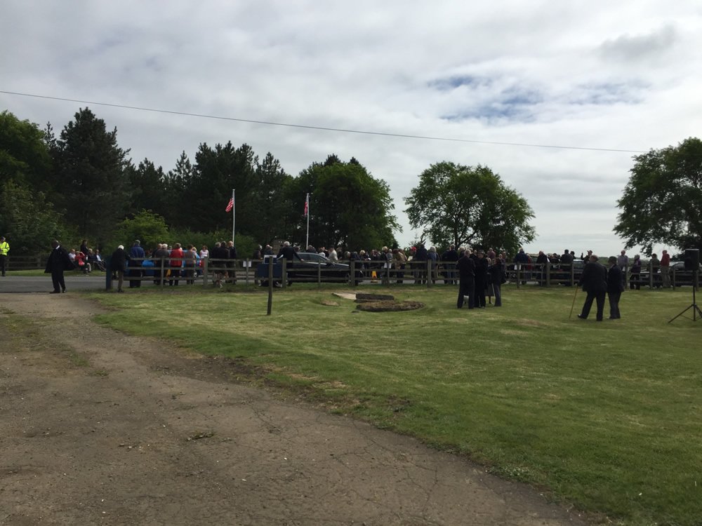 A crowd of people gathers outdoors near a wooden fence with flagpoles and trees in the background under a cloudy sky. Some people stand in groups on the grass, whilst others face the fenced area. - on localmedic