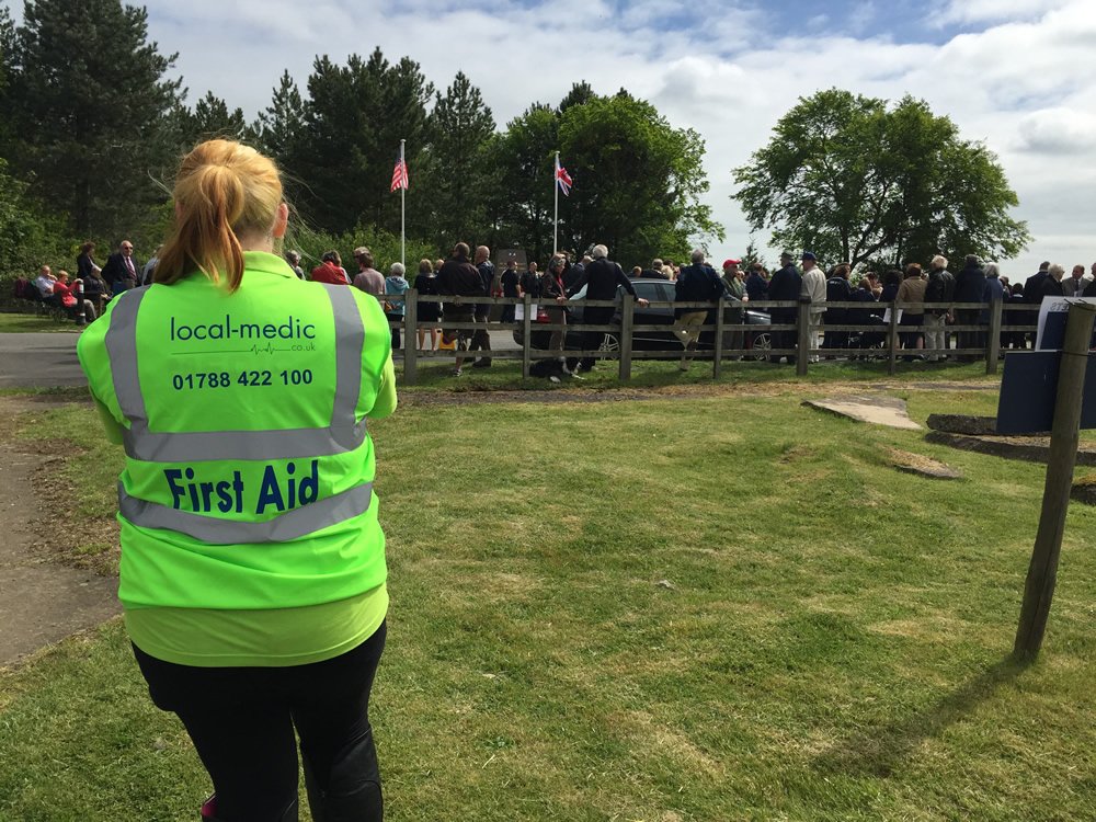 A person in a bright green "First Aid" vest stands on grass, facing a group of people gathered near a fence and flagpoles outdoors, under a partly cloudy sky, during what appears to be a public event. - on localmedic
