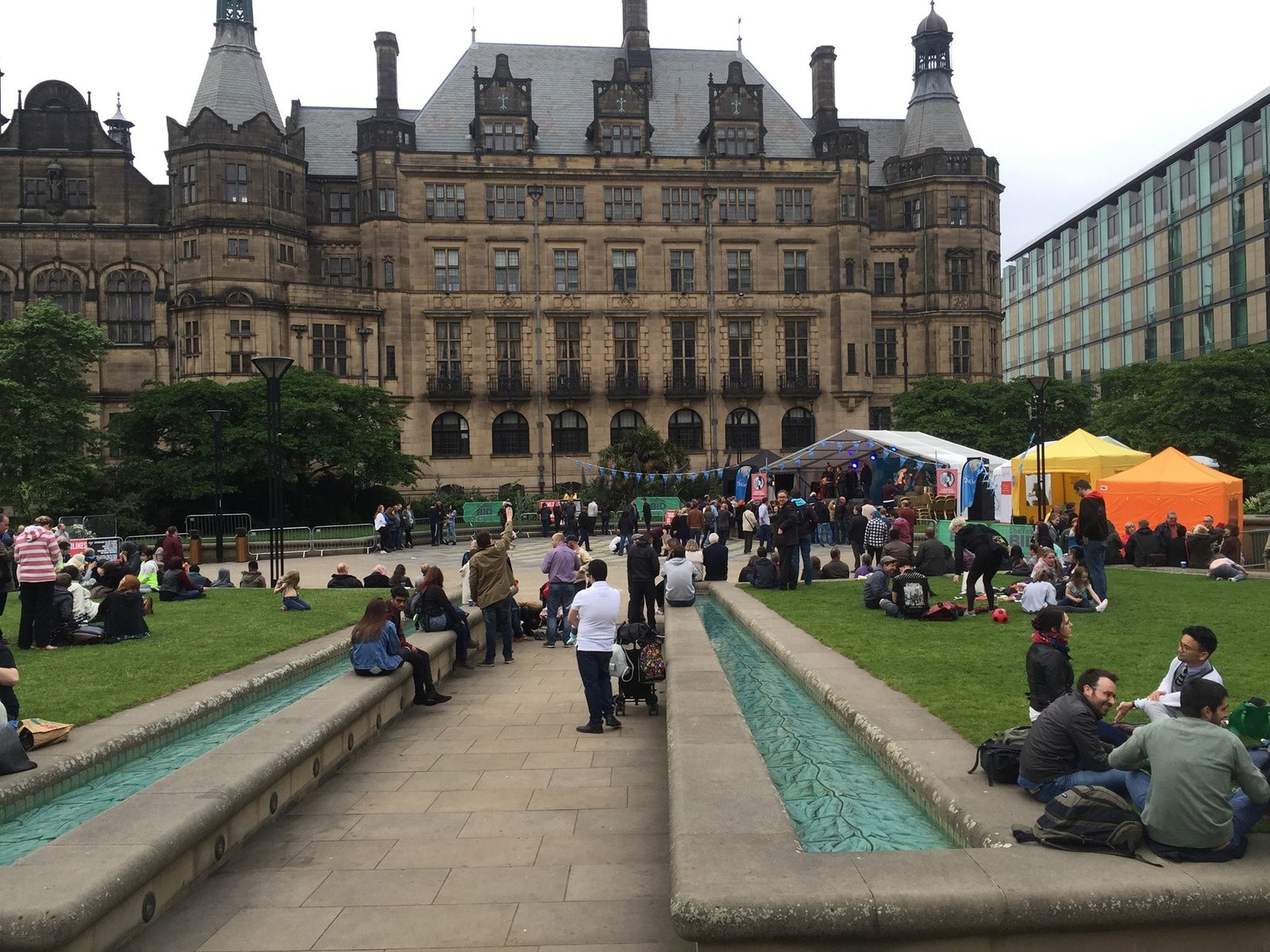 People sit and gather on grass and near shallow water features in an urban square with a large historic building and festival marquees in the background. The atmosphere is lively and relaxed. - on localmedic