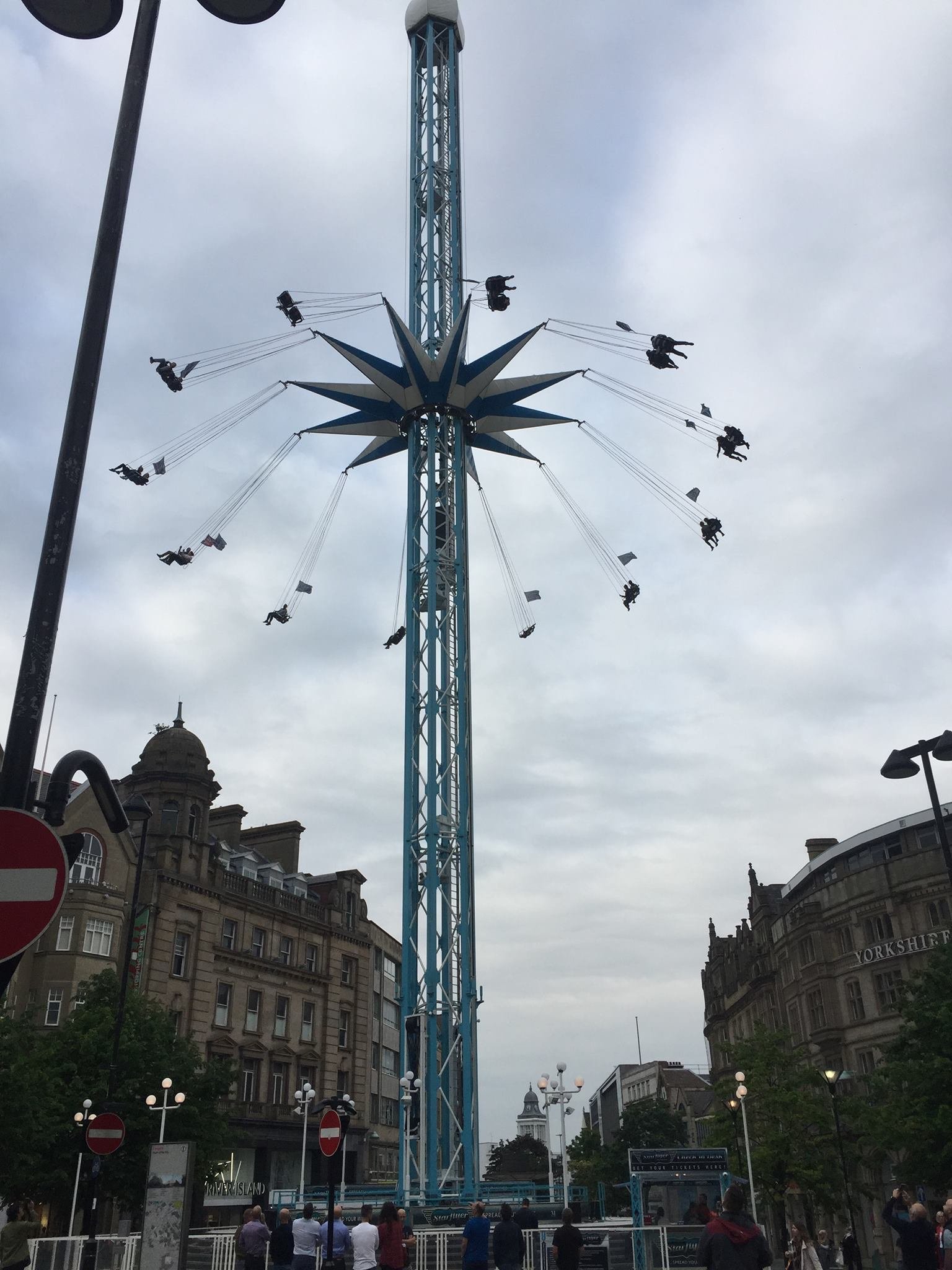 A tall, blue and white star-shaped swing ride with people seated in swings spins high above a city street lined with old buildings under a cloudy sky. - on localmedic